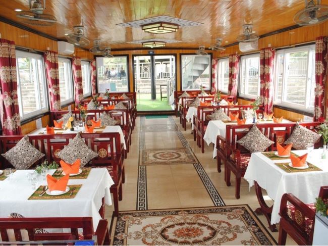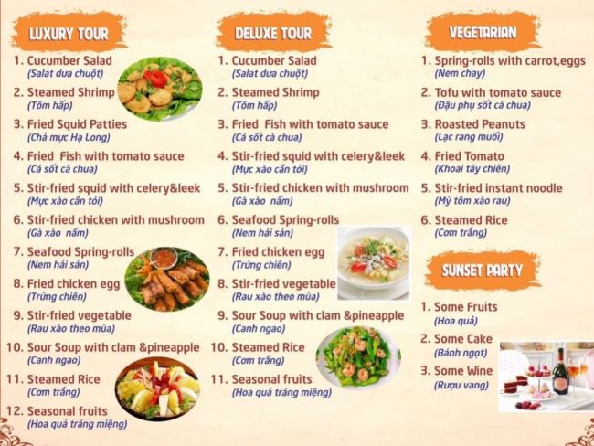 - 12:30 Enjoy set menu lunch on the boat with many special dishes of Halong. While having lunch, you all can see the beautiful scenery on both sides with thousands of limestone such as Fighting Chicken and Incense Buner Islets – 2 symbols of Halong Bay