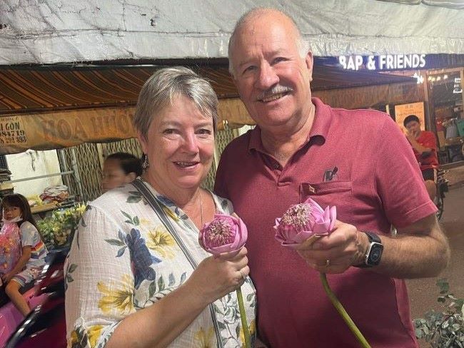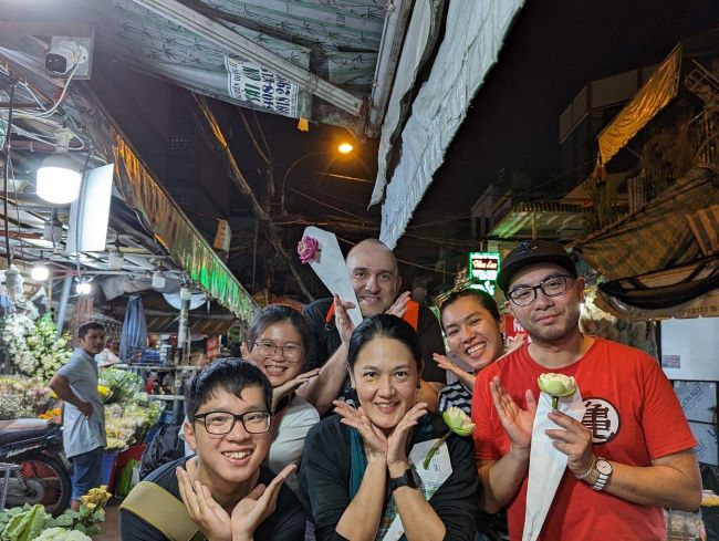 - After that, ride to “the biggest flower market” which is opened 24/7, and take a short walk to see beautiful bouquets at the shop, get a secret gift from your local guides. Go deeper to alleyways to see “street food market” and see how local live and eat. And enjoy more and more foods (Vietnamese Pizza – Bánh Tráng Nướng, Grilled Beef with Lemongrass – Bò Nướng Sả..,)